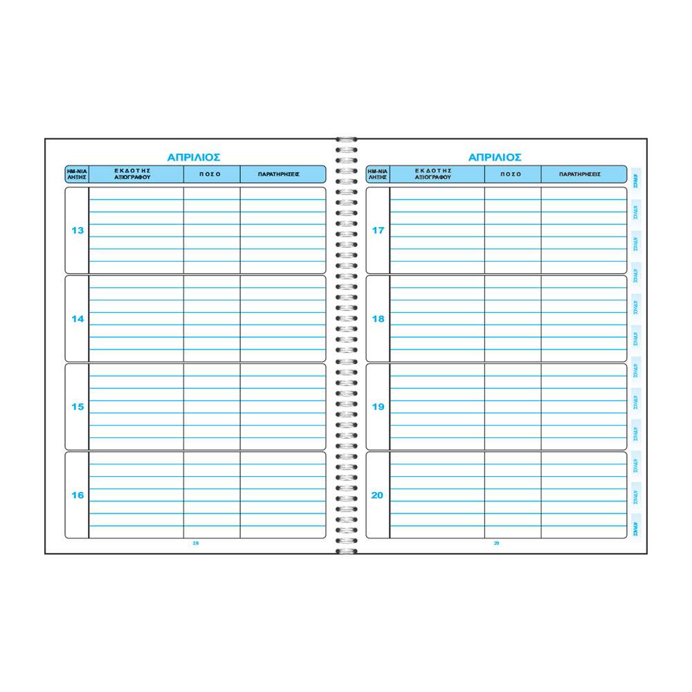 - Αριθμός Φύλλων: 50 φύλλα, αρκετά για την καταγραφή όλων των λήξεων αξιογράφων μέσα σε ένα έτος.